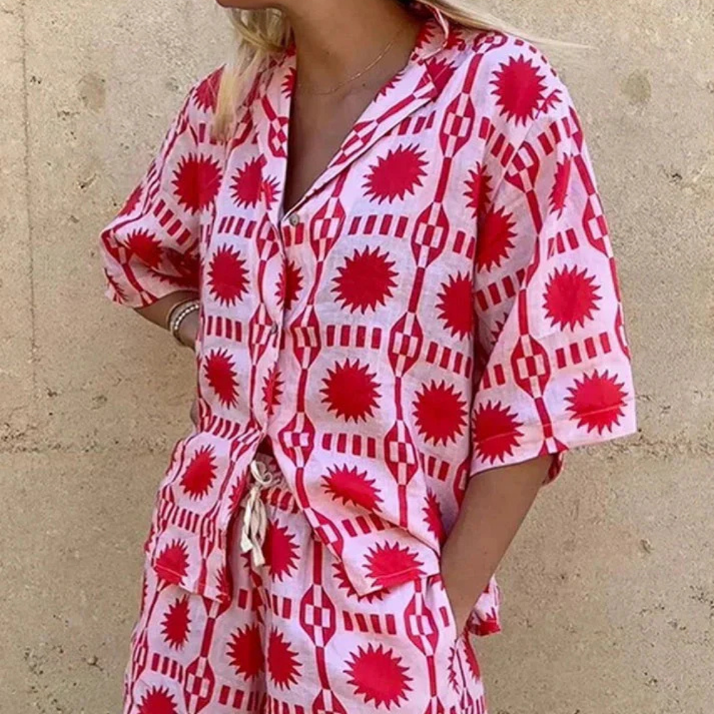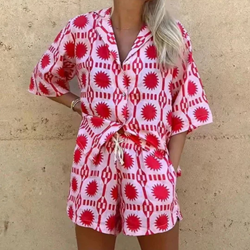 Das Leane  Zusammen ist die perfekte Option für alle, die Leichtigkeit und Komfort suchen und dabei in diesem Sommer trendy sein wollen. Es besteht aus einem modernen Design-Oberteil, das zu Shorts passt, und vereint lässigen und schicken Stil - ideal für sonnige Tage.