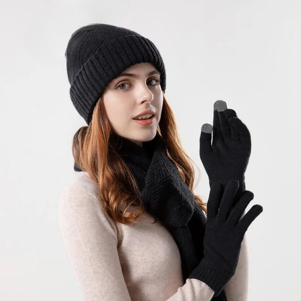 Entdecken Sie unser dreiteiliges Unisex-Set, das der perfekte Begleiter für den Herbst ist und gleichzeitig Ihrem Stil einen Hauch von Eleganz verleiht. Jedes Teil dieses Sets - Mütze, Schal und Handschuhe - wurde sorgfältig aus einem isolierenden Material gefertigt, das Komfort und Wärme bietet, damit Sie Ihre Aktivitäten im Freien genießen können, ohne sich vor der Kälte fürchten zu müssen.